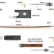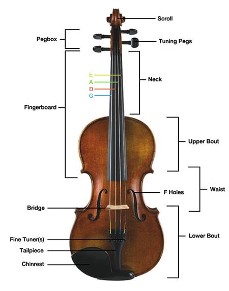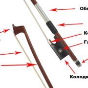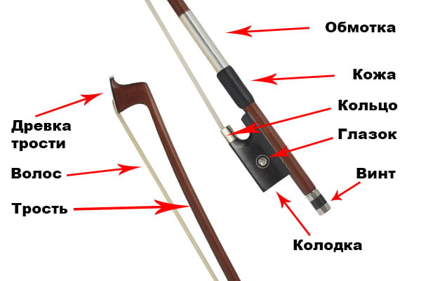 Завиток-Толгой,Колки-Чих,Шейка-Хүзүү,Гриф-Хурууны даралт-том гриф,Струны-Чавхдас,Подставка-Мар-Гүүр,Эфы-Эф дууны нүх,Подбородник-Эрүүвч,Верхняя дека-Дээд тавцан,Нижняя дека-Доод тавцан. Хөгжим дотор гүүр модны нэг талын хөлийг түшсэн дугуй савхан мод бий.Үүнийн Душка гэж нэрлэх бөгөөд энэ нь нүүр болон ар талыг холбож дуугаралтын чичиргээ үүсгэн дамжуулах зориулалттай учраас уг мод байсан байрнаасаа жаахан хөдлөхөд л хөгжмийн дуунд асар их өөрчлөлт ордог. Мөн хөгжим доргилт авахад амархан унадаг тул тэр дор нь хөгжмийн мастертаар тохируулж тогтоолгоход анхаараарай.